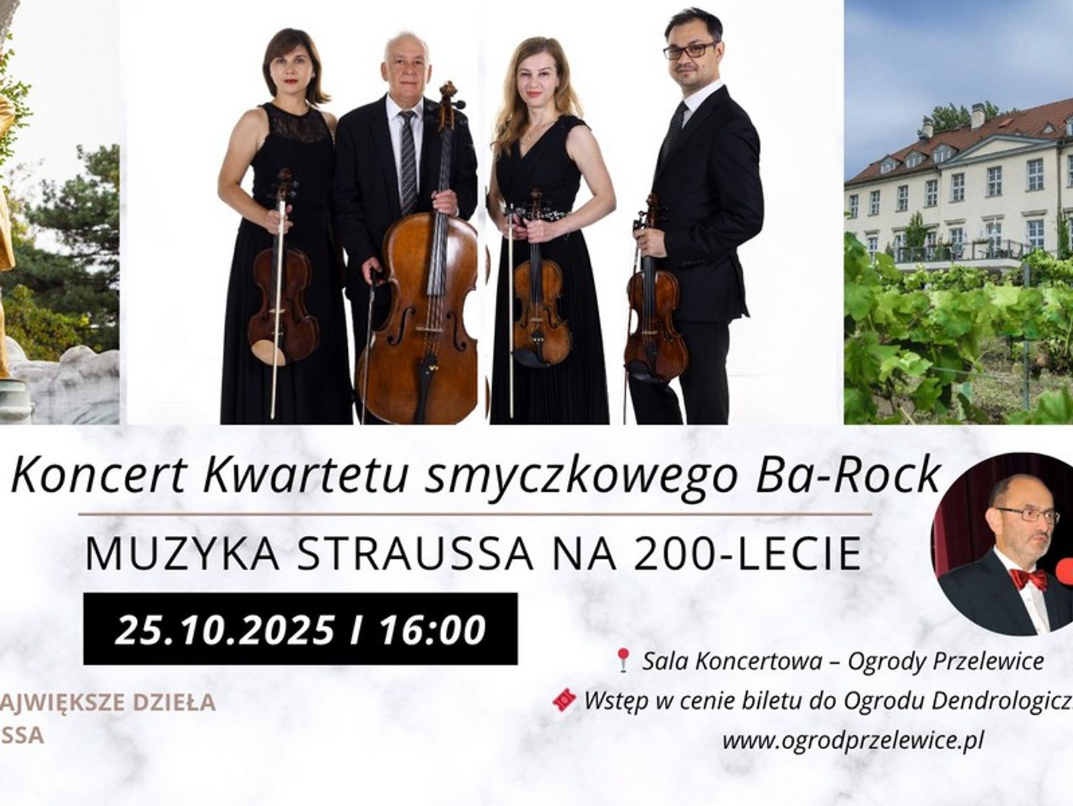 25 października 2025 r. o godz. 16:00 w Sali Koncertowej Pałacu w Ogrodach Przelewice odbędzie się wyjątkowy koncert kwartetu smyczkowego „Ba-rock” z okazji 200. rocznicy urodzin Johanna Straussa. W eleganckich wnętrzach zabytkowego Pałacu zabrzmią najsłynniejsze walce, polki i marsze wiedeńskiego mistrza.