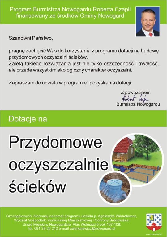 Regulamin oraz wnioski dostępne są: w sekretariacie Urzędu Miejskiego pokój nr. 5, w Wydziale Gospodarki Komunalnej, Mieszkaniowej i Ochrony Środowiska, plac Wolności 5, pok. 107-108 oraz na stronie urzędu miejskiego http://www.nowogard.pl/aktualnosci/przydomowe-oczyszczalnie-sciekow