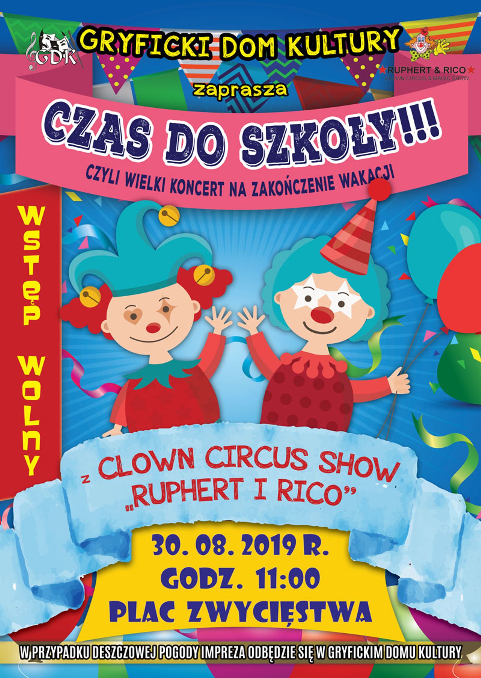 Zapraszamy na moc wspaniałych atrakcji na zakończenie wakacji! Zabawa w wykonaniu jednego z najlepszych w Europie duetu clownów cyrkowych Rupherta i Rico - zdobywców wielu prestiżowych nagród na festiwalach sztuki cyrkowej, przeglądach teatrów ulicznych i konkursach cyrkowych.