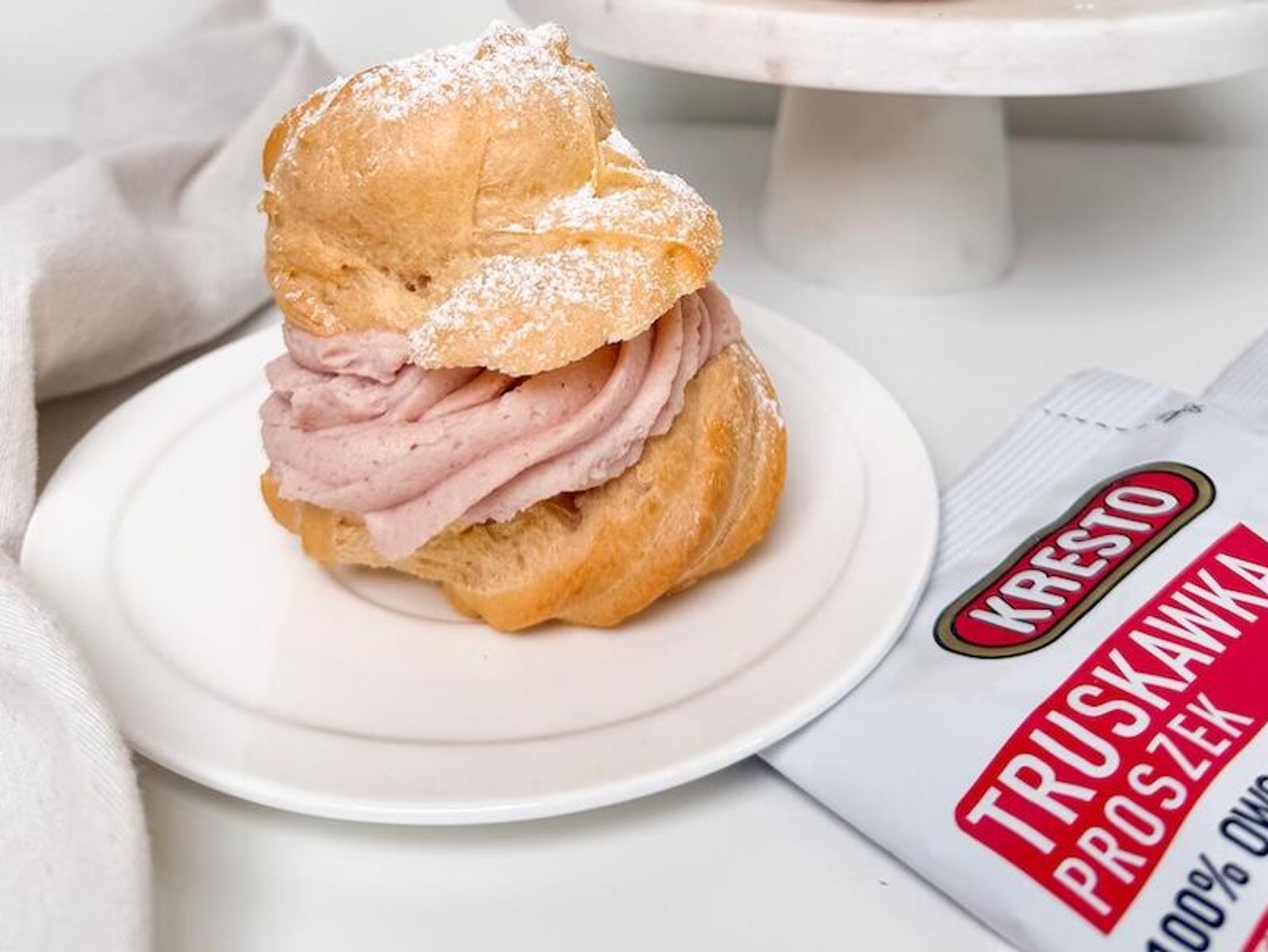 - Ubij śmietankę z cukrem pudrem, pod koniec dodaj proszek z truskawek. Dolne połówki ptysiów napełnij kremem, przykryj wierzchami i oprósz cukrem pudrem.