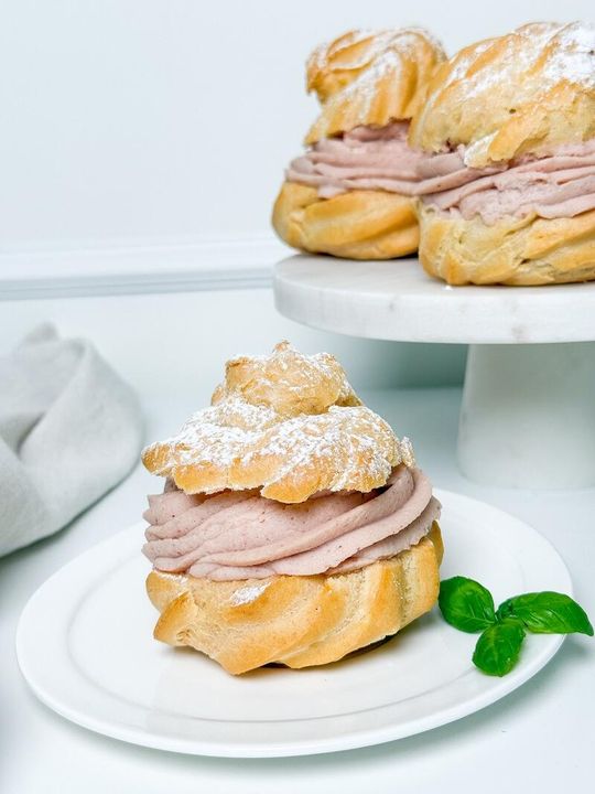 - Piecz w 200°C (góra–dół) przez 25–30 minut do uzyskania złocistego koloru (nie otwieraj piekarnika w tym czasie). Po upieczeniu uchyl drzwiczki i pozostaw ptysie na 10 minut do przestudzenia, następnie przekrój na pół.
