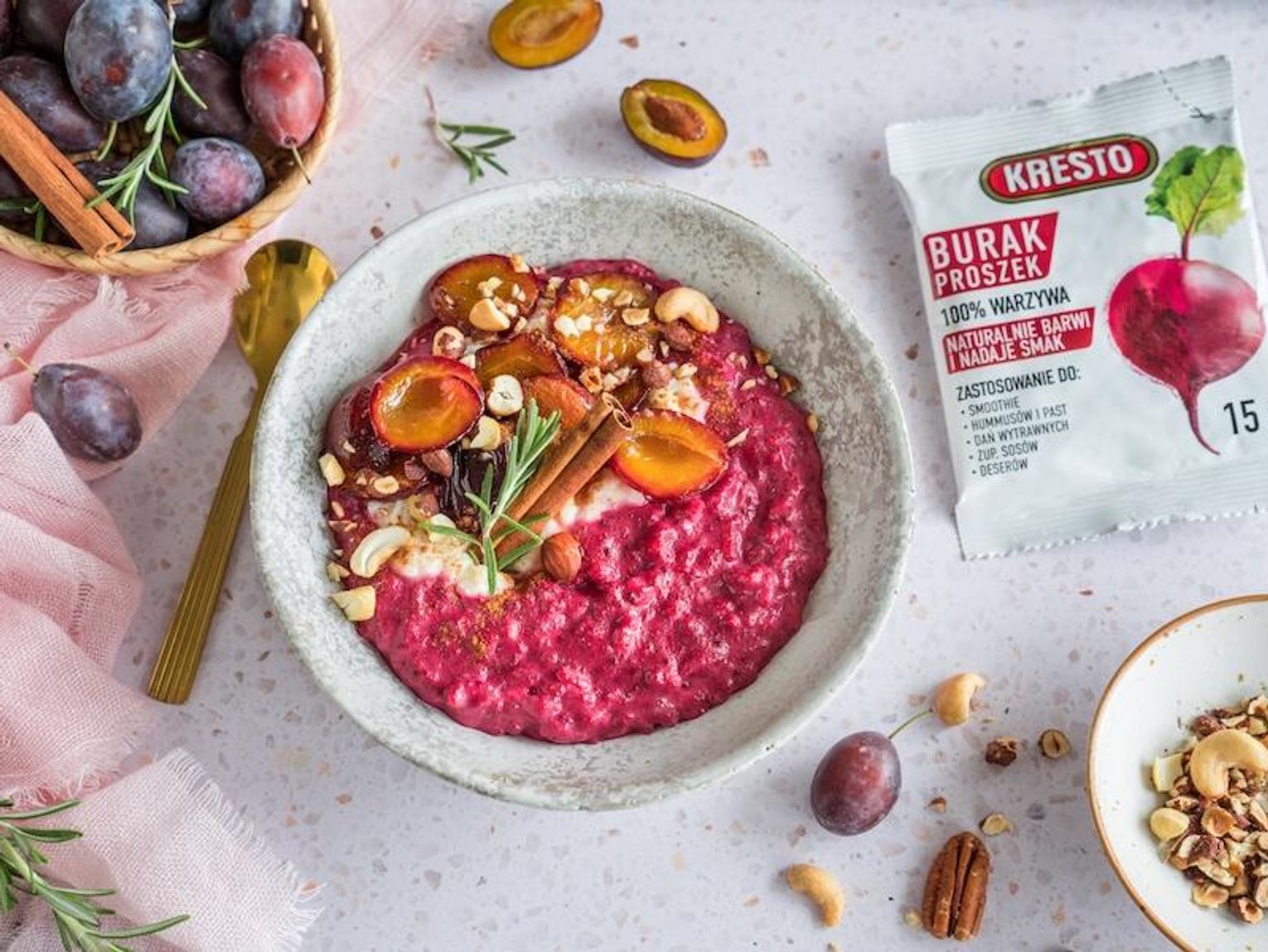 Kolorowy pudding ryżowy z karmelizowaną śliwką to deser, który łączy w sobie kremową delikatność, głębię owocowej słodyczy i subtelny, naturalny kolor buraka. Jedwabisty, ciepły i pełen aromatu — świetnie sprawdzi się jako słodka przerwa w ciągu dnia, rozgrzewający podwieczorek lub efektowny deser dla gości. Jego zapach i smak sprawiają, że trudno poprzestać na jednej łyżeczce.