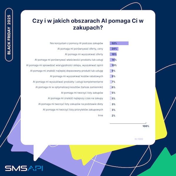 Badanie SMSAPI pokazuje, że choć Black Friday jest już starym zakupowym świętem, nowy zawodnik zmienia reguły gry. Niemal co czwarta osoba (24 proc.) pyta o najlepszą cenę danego produktu jeden dużych modeli językowych np. ChatGPT, bez wchodzenia w porównywarki internetowe, a co siódma (14 proc.) z pomocą chata porównuje specyfikacje i właściwości produktów.
