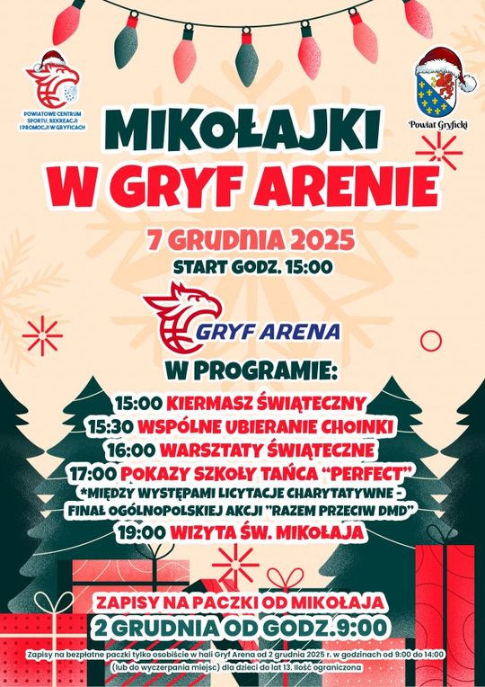 Zarząd Powiatu Gryfickiego serdecznie zaprasza wszystkie dzieci wraz z rodzinami na wyjątkowe, pełne magii świąteczne popołudnie w Gryf Arenie!