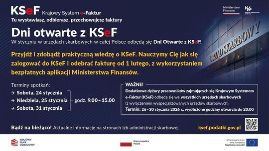 24 i 25 stycznia (sobota, niedziela) oraz 31 stycznia (sobota) 2026 r. we wszystkich urzędach skarbowych (z wyjątkiem wyspecjalizowanych) odbędą się dni otwarte nt. Krajowego Systemu e-Faktur.