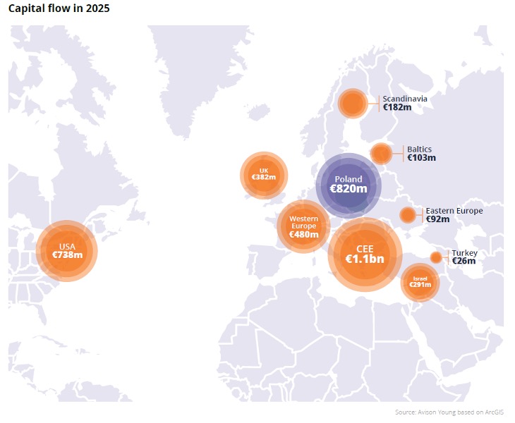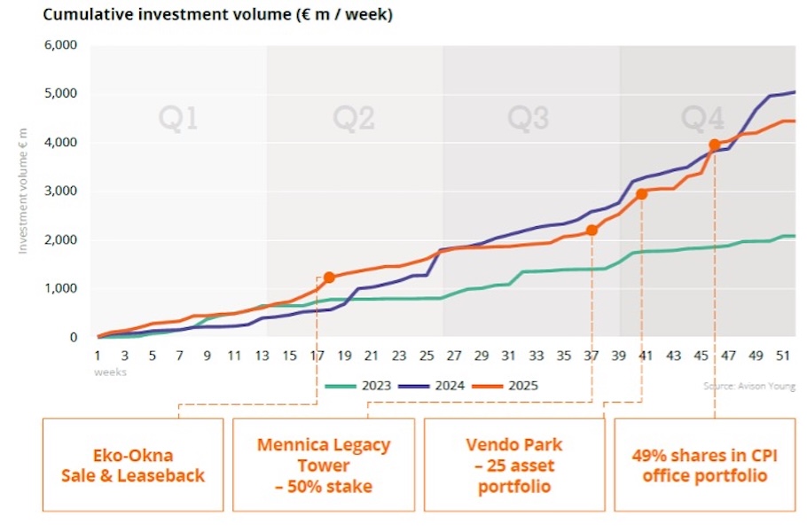 - 4,5 miliarda euro (-13% Y-O-Y) – całkowity wolumen inwestycyjny w 2025 r.