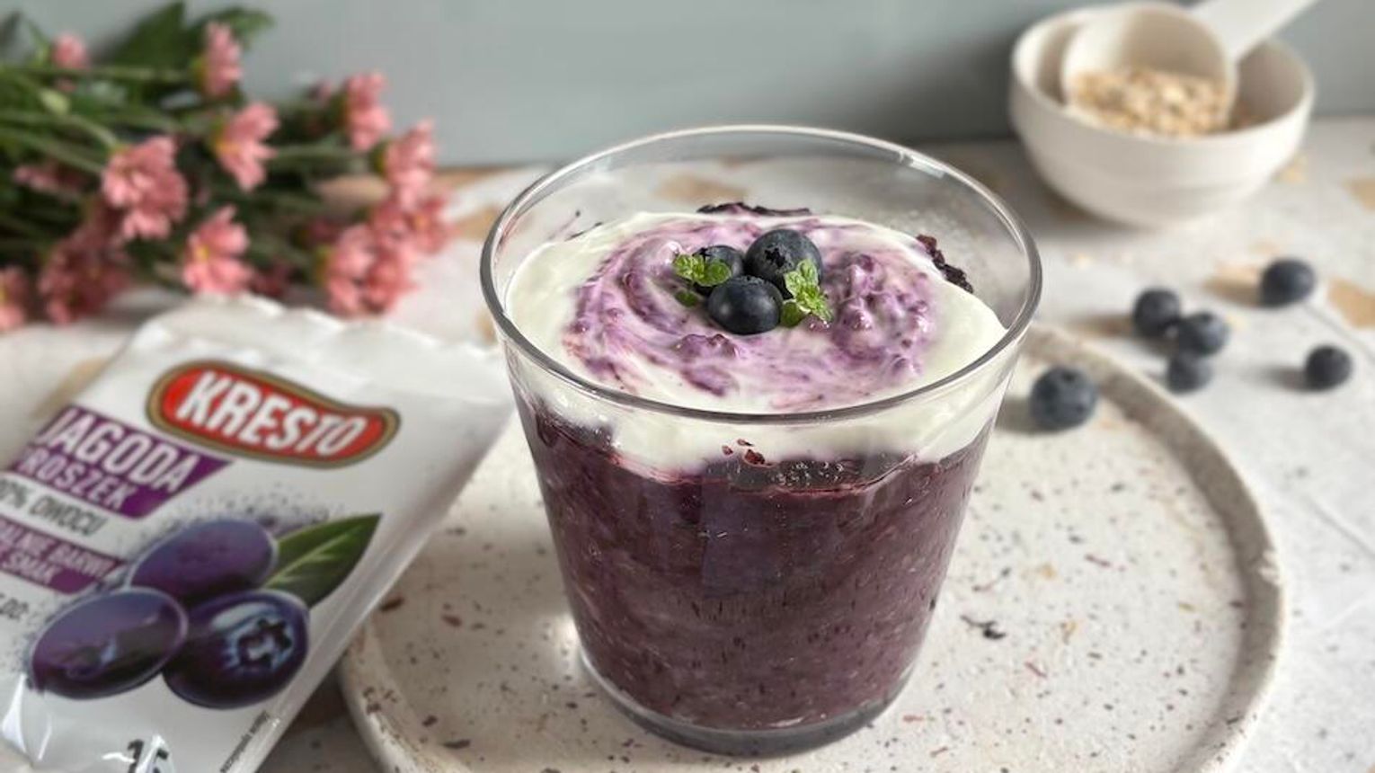 Kremowa, delikatnie słodka i intensywnie jagodowa. Ta owsianka to idealny sposób na spokojny poranek — naturalna słodycz banana, głęboki kolor i smak liofilizowanych jagód KRESTO oraz lekka jogurtowa chmurka, która otula całość.