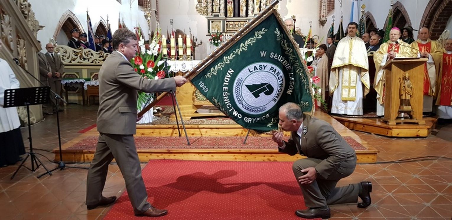 Na zdjęciu Andrzej Szelążek, dyrektor Regionalnej Dyrekcji Lasów Państwowych w Szczecinie, przekazuje sztandar dla Nadleśnictwa w Gryficach na ręce Wojciech Pietrzak, nadleśniczego z Gryfic.