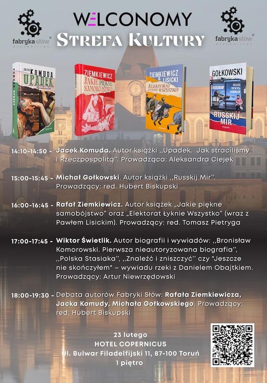 Wyjątkowym uzupełnieniem eksperckich debat jest Strefa Kultury zlokalizowana na pierwszym piętrze Hotelu Copernicus, która powstała we współpracy z wydawnictwem Fabryka Słów. To tutaj literatura spotka się z historią i polityką podczas autorskich spotkań z Jackiem Komudą, Michałem Gołkowskim, Wiktorem Świetlikiem oraz Rafałem Ziemkiewiczem. Zwieńczeniem pierwszego dnia będzie debata autorów Fabryki Słów pod tytułem „Anatomia upadku: Historyczne przestrogi a współczesne zagrożenia dla bytu Rzeczypospolitej”, którą o godzinie 18:00 poprowadzi redaktor naczelny Dziennika Gazety Prawnej, Tomasz Pietryga.