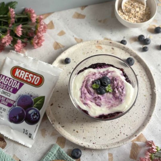 Kremowa, delikatnie słodka i intensywnie jagodowa. Ta owsianka to idealny sposób na spokojny poranek — naturalna słodycz banana, głęboki kolor i smak liofilizowanych jagód KRESTO oraz lekka jogurtowa chmurka, która otula całość.
