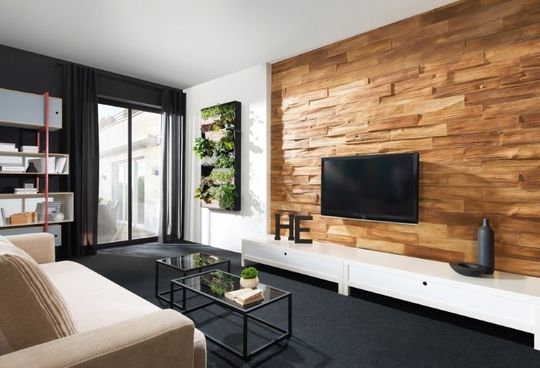 Moda na czarno-białe wnętrza trwa w najlepsze. Designerzy i projektanci wnętrz uwielbiają to uniwersalne połączenie za jego elegancję i szerokie możliwości kompozycyjne. W takim wnętrzu świetnym tłem dla telewizora będzie designerska deska elewacyjna o strukturze ciosanej deski, np. Timber. – Taki intrygujący kontrapunkt doda wnętrzu pazura, ożywi je i wprowadzi do aranżacji więcej ciepła oraz przytulności – zauważa Robert Szybiak.