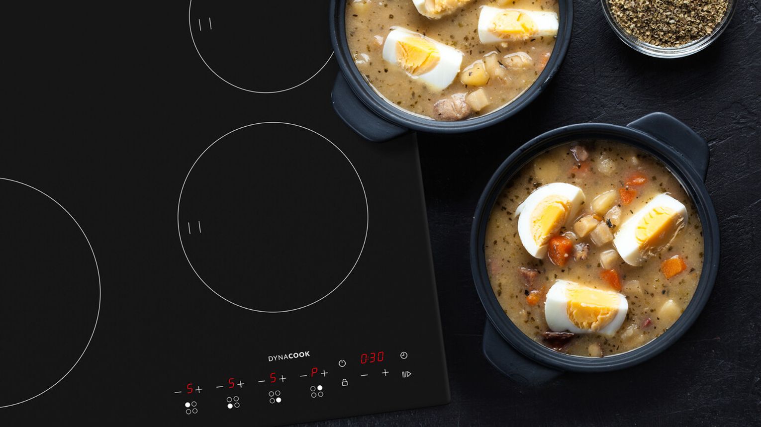 - Pola grzewcze o średnicy 14–18 cm pozwalają w jednym czasie ugotować nawet 10 jajek przeznaczonych na faszerowane przekąski oraz kolejną porcję do świątecznych dekoracji. Wystarczy ustawić moc na poziomie 9, zagotować wodę, a potem zmniejszyć grzanie do poziomu 6. Po około 8 minutach należy ostudzić jajka zimną wodą, aby przerwać gotowanie i uzyskać idealnie kremowe wnętrze. Z kolei na większych polach, sięgających 22 cm średnicy, równolegle przygotujesz ziemniaki w mundurkach lub inne warzywa potrzebne do tradycyjnej sałatki jarzynowej – mówi Stanisław Szyling, ekspert DYNACOOK.