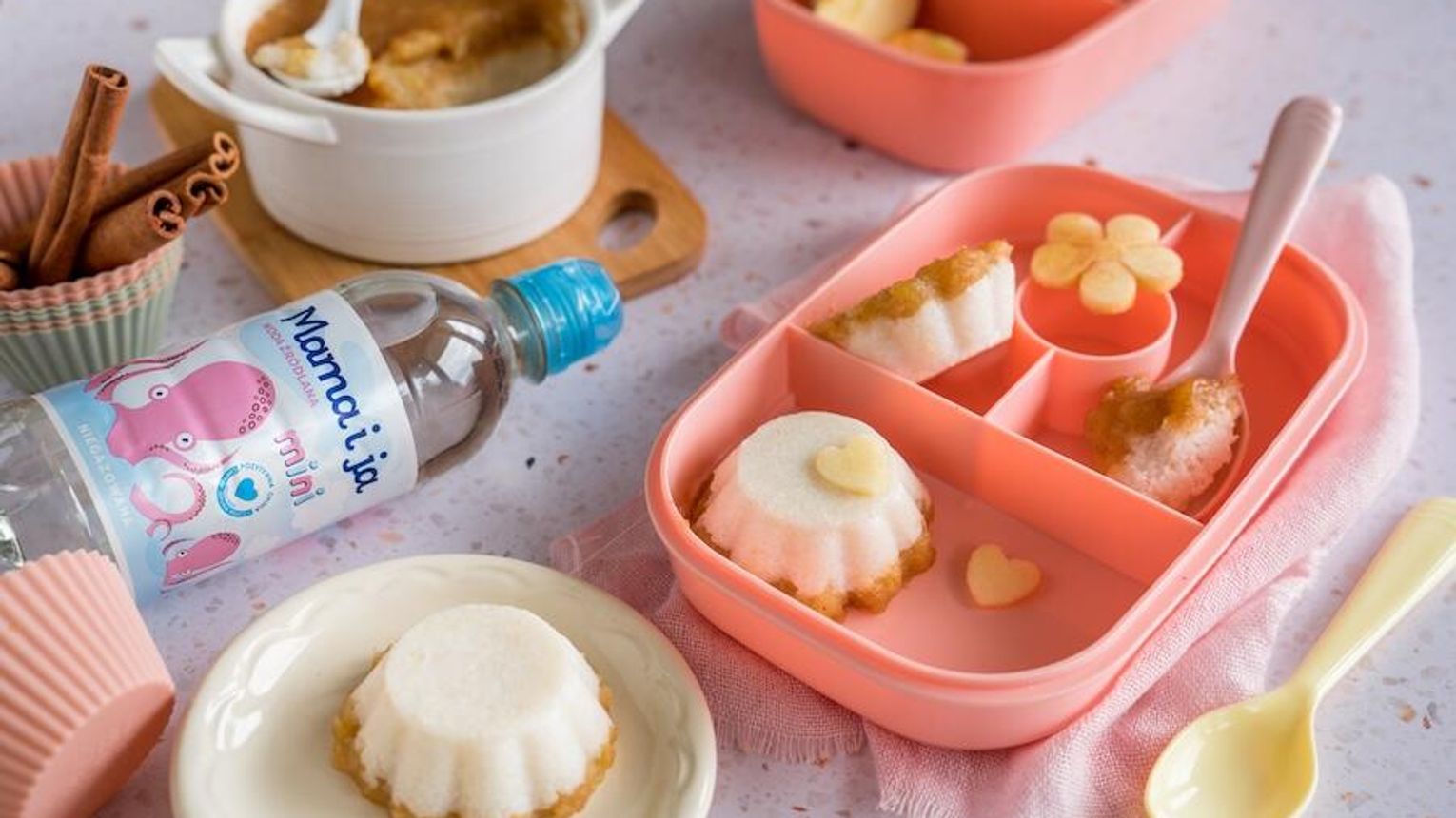 3. Ryż przełóż do silikonowych foremek na babeczki do 3/4 wysokości. Dopełnij je musem jabłkowym i wyrównaj wierzch.
