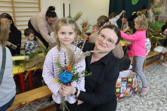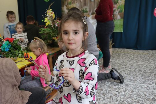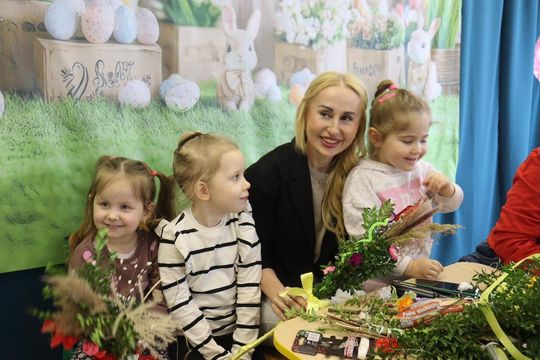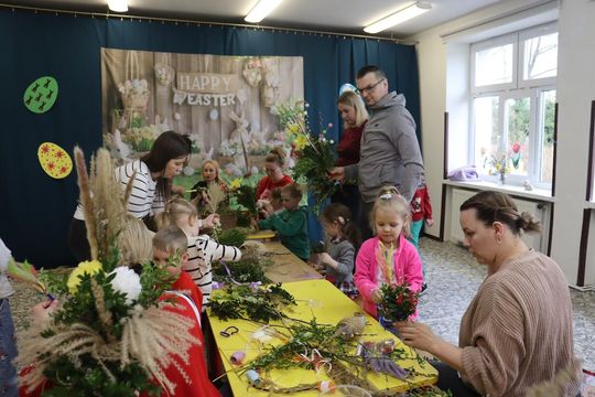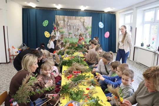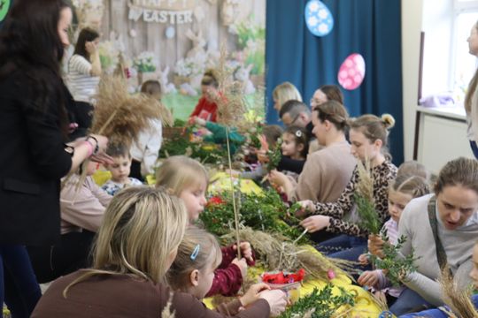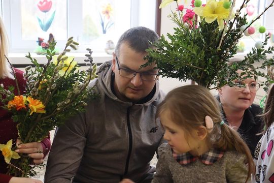 Sala zamieniła się w prawdziwą artystyczną pracownię pełną kolorowej bibuły, bazi, bukszpanu i wielu kolorowych wstążek. Dyrekcja, Rodzice oraz dzieci tworzyli przepiękne palmy z bukszpanu, suchej trawy, kłosów zboża, gałązek wierzby, wstążek i kwiatów z bibuły. Celem warsztatów było nie tylko wspólne, miłe spędzenie czasu ale przede wszystkim przybliżenie dzieciom tradycji związanych ze Świętami Wielkanocnymi i zgłębienie ich symboliki. Dzieci wiedzą już, że palma wielkanocna jest symbolem odradzającego się życia.