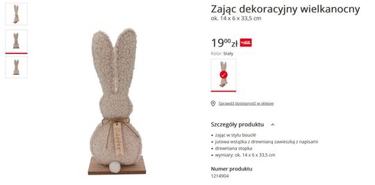 Jeśli nie masz czasu na układanie skomplikowanych stroików, postaw na jeden mocniejszy akcent. Ten zając z KiK to dekoracja, która praktycznie „robi się sama”. Jest wysoki, wyrazisty i wykończony modną tkaniną w stylu bouclé, która nadaje mu rustykalny charakter. Drewniana stopka i jutowa wstążka z zawieszką wprowadzają naturalny akcent, który świetnie komponuje się z jasnymi tekstyliami, świecami czy gałązkami w wazonie. To świetna opcja last minute – wygląda jak element przemyślanej aranżacji, a kosztuje tylko 19 zł.