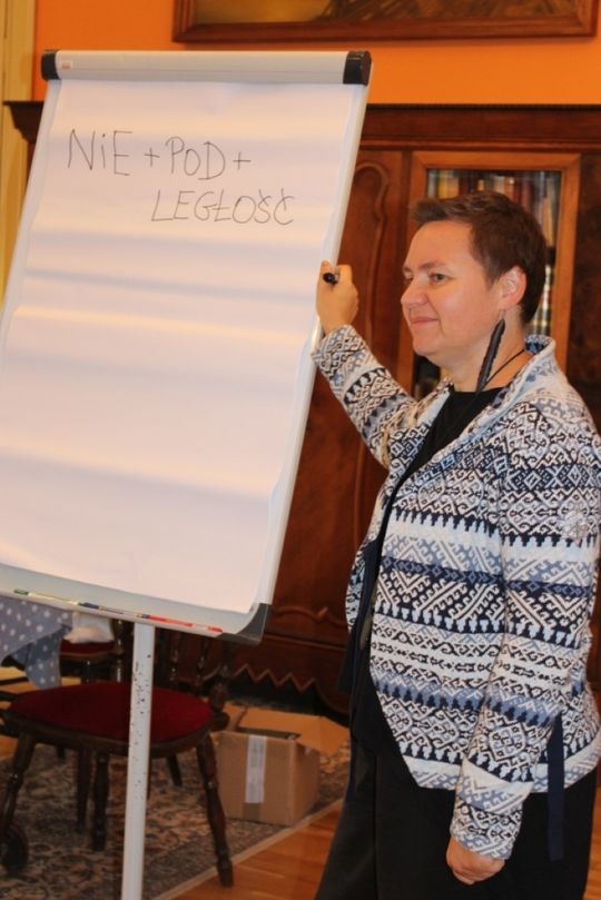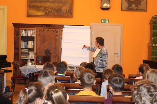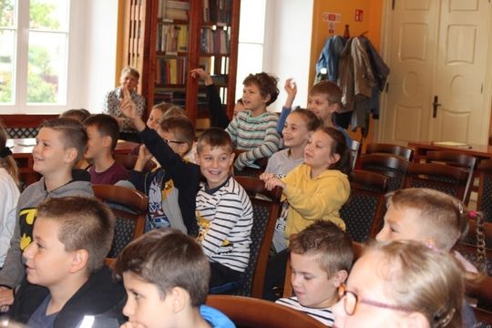 Zofia Stanecka w świetnie prowadzonej rozmowie przekazała dzieciom wiele cennych informacji o procesie powstawania książki i ludziach, którzy ją współtworzą – od momentu pojawienia się pomysłu w głowie pisarza, aż po pojawienie się książki w księgarni bądź w bibliotece. Jak powiedziała podczas spotkania: „ W książce znajduje się cały świat, bo to taka dziwna i magiczna rzecz, która jest nieżywa , ale jednak żyje poprzez historie w niej zapisane”. Rozszyfrowaliśmy słowo NIEPODLEGŁOŚĆ rozkładając je na czynniki pierwsze. Dyskutowaliśmy nad różnymi aspektami WOLNOŚCI. Wyjaśniliśmy sobie co to jest SYMBOL narodowy, a potem każdy narysował swój własny symbol. Coś co daje nam poczucie spokoju, satysfakcji, radości, niezależności. Wprowadzając i objaśniając różne nieznane terminy posługiwała się przykładami w postaci fragmentu czytanego z książki, a na tablicy (z talentem!) rysowała różne schematy lub osoby. Na pytanie skąd rodzą się pomysły, jako pierwsza odpowiedź nasuwa nam się, z głowy! Do współpracy z głową zaangażowane są też wszystkie zmysły, co bardzo pomaga autorowi w tworzeniu. Ważne jest też otoczenie w jakim się ma przyjemność pracować i tu Pani Zofia nas zaskoczyła , bo jej ulubionym miejscem jest… wanna.