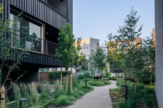 Zaprojektowany układ opiera się na budynkach dwulokalowych z podziałem poziomym, w których jedno mieszkanie znajduje się nad drugim. Większość z nich ma dostęp do wind obsługujących kilka budynków jednocześnie, co zwiększa komfort użytkowania i poprawia dostępność. Świadomie zagęszczono zabudowę w strefach komunikacyjnych, uzyskując większe odległości pomiędzy częściami ogrodowymi — czyli tam, gdzie mieszkańcy najbardziej potrzebują prywatności i przestrzeni.