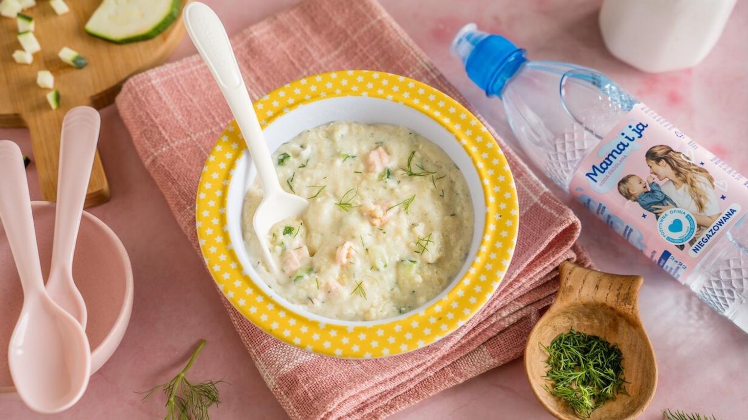 2/3 kaszy włóż do miski, dodaj mleko i zblenduj. Przelej do garnka z resztą kaszy, dodaj cukinię i łososia.