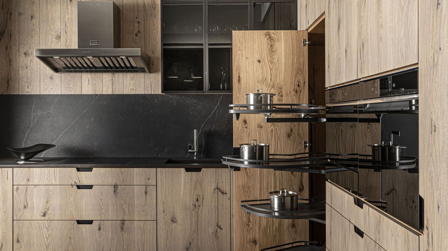 Kolejnym krokiem w ewolucji systemów kuchennych są rozwiązania modułowe, w których poszczególne elementy – jak szuflady, np. w wysokim cargo – wysuwają się niezależnie od siebie. Tego typu systemy oferują wyjątkową elastyczność, szczególnie w przypadku przechowywania produktów o niestandardowych gabarytach. Wysokie szafki, wyposażone w elektroniczne systemy otwierania, dodatkowo zwiększają komfort użytkowania, umożliwiając szybkie sprawdzenie zawartości bez konieczności manualnego otwierania, szczególnie w szafkach pod sufitem. To technologia, która wpisuje się w ideę „smart kitchen” – przestrzeni reagującej na potrzeby użytkownika w sposób intuicyjny i niemal niewidoczny.
