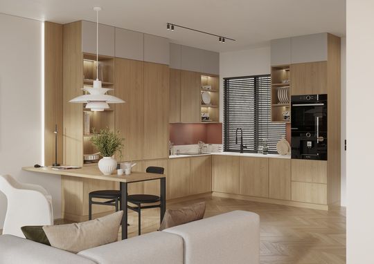 - Detale decydują o jakości przestrzeni. Systemy cargo dedykowane przechowywaniu przypraw czy desek do krojenia pozwalają utrzymać porządek i jednocześnie zapewniają szybki dostęp do najczęściej używanych akcesoriów. Równie istotne są rozwiązania ukrywające sprzęty kuchenne – takie jak fronty z podnośnikiem otwierane do góry, za którymi kryją się wysuwane półki z urządzeniami. Dzięki temu kuchnia zachowuje minimalistyczny charakter, a jednocześnie pozostaje w pełni funkcjonalna.