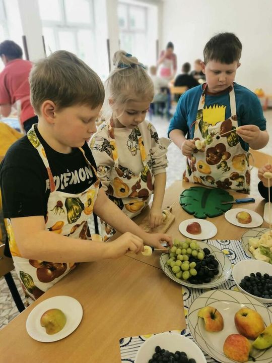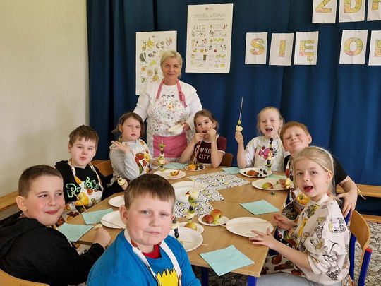 Najbardziej wyczekiwanym punktem programu była wspólna degustacja własnoręcznie przygotowanych potraw. Zdrowe przekąski znikały z talerzy błyskawicznie! Na podsumowanie zajęć dzieci omawiały wartości odżywcze owoców i warzyw, wymieniając, jak konkretne witaminy wpływają na ich zdrowie, odporność i świetne samopoczucie.