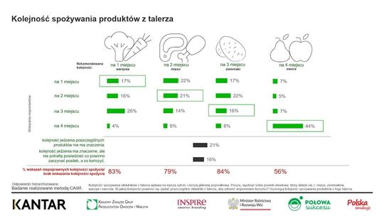 21% badanych uważa, że kolejność spożywania produktów z talerza nie ma znaczenia. A 16% jest zdania, że kolejność ma znaczenie, ale jej nie zna. Zdaniem ekspertów ma znaczenie, a brak owoców w codziennych posiłkach jest jednym z największych wyzwań żywieniowych.