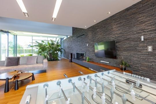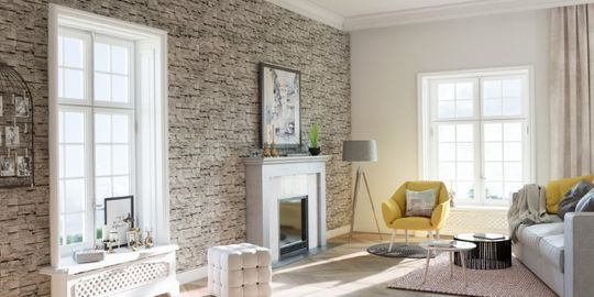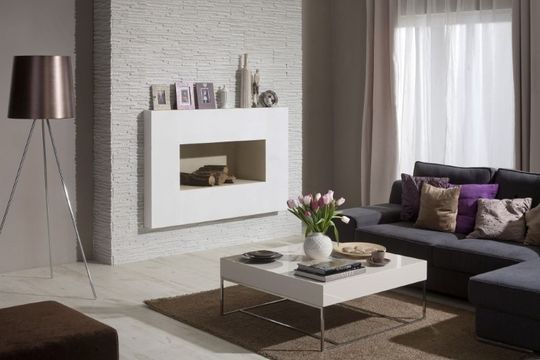 Szarość doskonale sprawdzi się także w stylizacjach eklektycznych, czerpiących inspiracje z różnych nurtów. Takie wnętrza lubią jasne tonacje. Płytki dekoracyjne Toledo o wyraźnym rysunku kamienia i srebrzystym odcieniu dodadzą elegancji i unikalnego charakteru białym wnętrzom, a przy tym pięknie wyeksponują kominek – zarówno nowoczesny, jak i ten bardziej klasyczny.