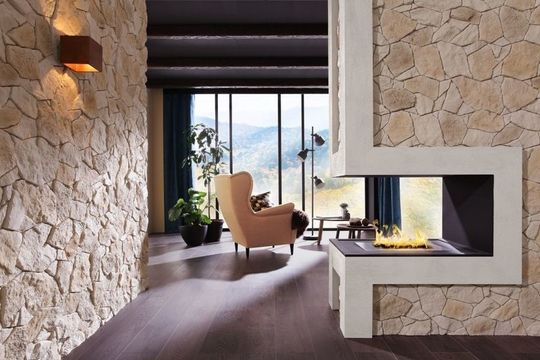 Jeśli są wśród nas miłośnicy tradycyjnych rozwiązań to z pewnością zachwyci ich wykończenie ściany za kominkiem białym kamieniem dekoracyjnym o subtelnej fakturze, np. Palermo 1. Bardzo drobno cięty kamień wprowadzi do nowoczesnych wnętrz delikatne ciepło, ożywi je i nada mu bardziej reprezentacyjnego charakteru. Jeśli mamy kominek z półką, możemy ustawić na nim rodzinne zdjęcia i dekoracyjne dodatki w kolorze srebra lub złota – całość nabierze bardziej szlachetnego wyrazu i stanie się jeszcze przytulniejsze.