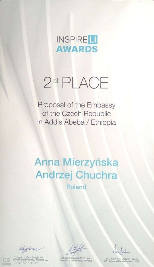 Konkurs zorganizowany był przez Uniwersytet Technologiczny w Pradze, Ministerstwo Spraw Zagranicznych Republiki Czeskiej i Inspireli Awards. Zadaniem uczestników było zaprezentowanie wizji budynku Ambasady Republiki Czeskiej w Addis Abebie. Konkurs przeprowadzono w dwóch etapach. Na pierwszy wpłynęło 281 prac z całego świata. Do drugiego etapu zakwalifikowano 25 wybranych projektów.