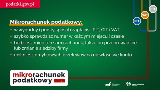 - w wygodny i prosty sposób zapłacisz PIT, CIT i VAT na jeden, stały, indywidualny mikrorachunek podatkowy - nie będziesz już wybierać oddzielnych rachunków,