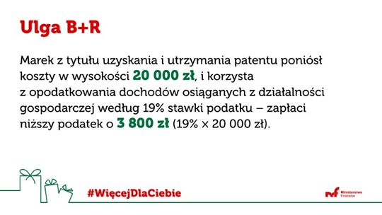 Dzięki zmianom wprowadzonym w uldze B+R podatnicy mogą teraz odliczyć 100 proc. kosztów z tytułu uzyskania i utrzymania patentu. Jeżeli z tego tytułu ponieśli koszty np. w wysokości 20 000 zł i korzystają z opodatkowania dochodów osiąganych z działalności gospodarczej według 19 proc. stawki podatku, to zapłacą podatek niższy o 3 800 zł (19 proc. x 20 000 zł).