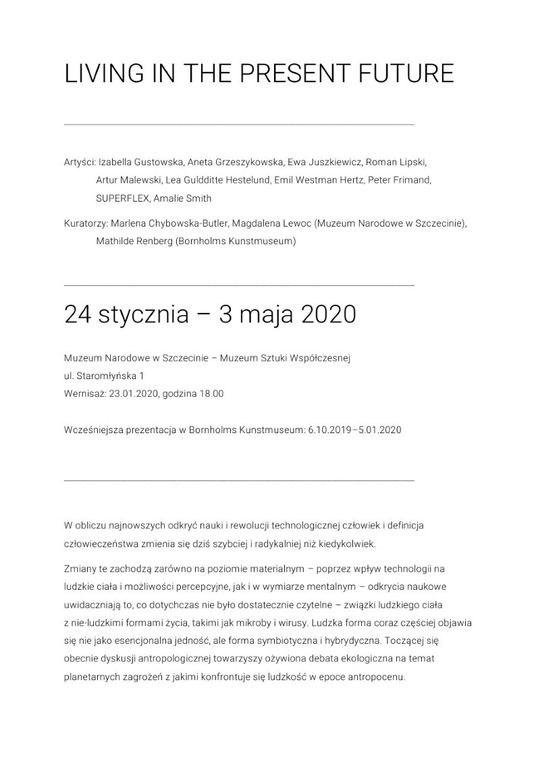 Przed nami wyjątkowe święto sztuki! Już w czwartek, 23 stycznia 2020 roku o godzinie 18.00 zapraszam do Muzeum Narodowego w Szczecinie – Muzeum Sztuki Współczesnej na otwarcie wystawy czasowej „Living in the Present Future”.