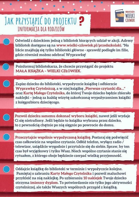 W wyprawce dzieci otrzymają także Kartę Małego Czytelnika. Za każdą wizytę w bibliotece Mały Czytelnik dostanie naklejkę, a po zebraniu dziesięciu zostanie uhonorowany nagrodą, potwierdzającą jego czytelnicze zainteresowania. W wyprawce znajdą coś dla siebie także rodzice i opiekunowie – przygotowana dla nich broszura informacyjna „Książką połączeni, czyli przedszkolak idzie do biblioteki” przypomni o nieocenionej roli czytania w rozwoju ich dziecka oraz o korzyściach wynikających z częstego odwiedzania biblioteki.