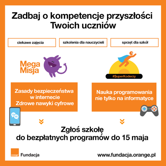 Tegoroczny nabór do MegaMisji i #SuperKoderów potrwa do 15 maja. Szkoły mogą zgłaszać się do obu programów lub tylko jednego, wypełniając prosty formularz online na https://fundacja.orange.pl/nabor-szkol i rozwiązując wspólnie z uczniami zadanie rekrutacyjne. Przygotowano je z uwzględnieniem realiów zdalnego nauczania. Komisja oceni je pod kątem pomysłowości, zaangażowania dzieci i wykorzystania cyfrowych narzędzi. Listę szkół przyjętych do programów opublikuje w czerwcu, aby zajęcia mogły zacząć się od nowego roku szkolnego.