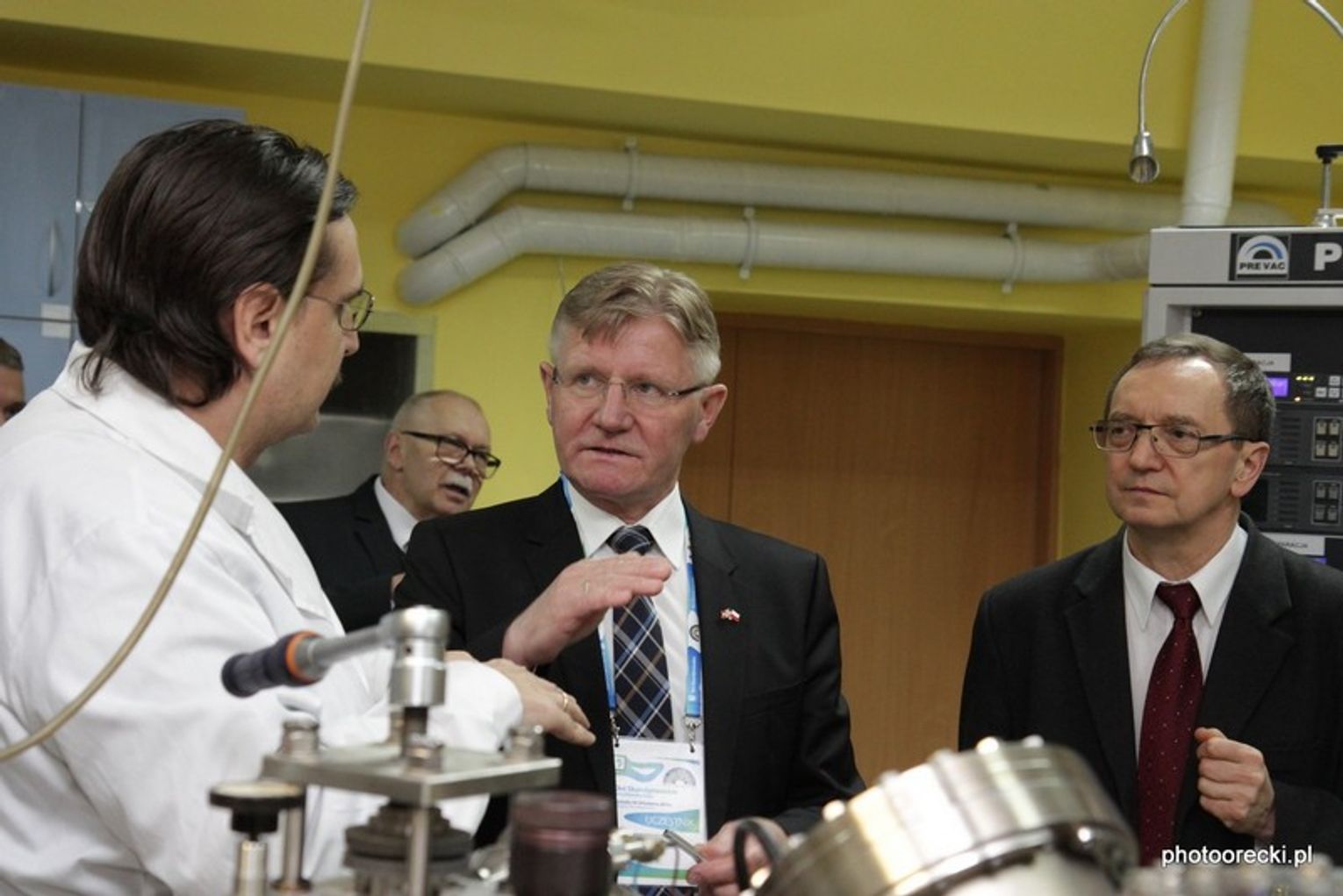Karsten Klepsvik pyta prof. Dariusza Moszyńskiego, operatora spektrometru XPS, o szczegóły działania aparatu. Na drugim planie mecenas Jan Antoni Kubiak, Konsul Honorowy Norwegii