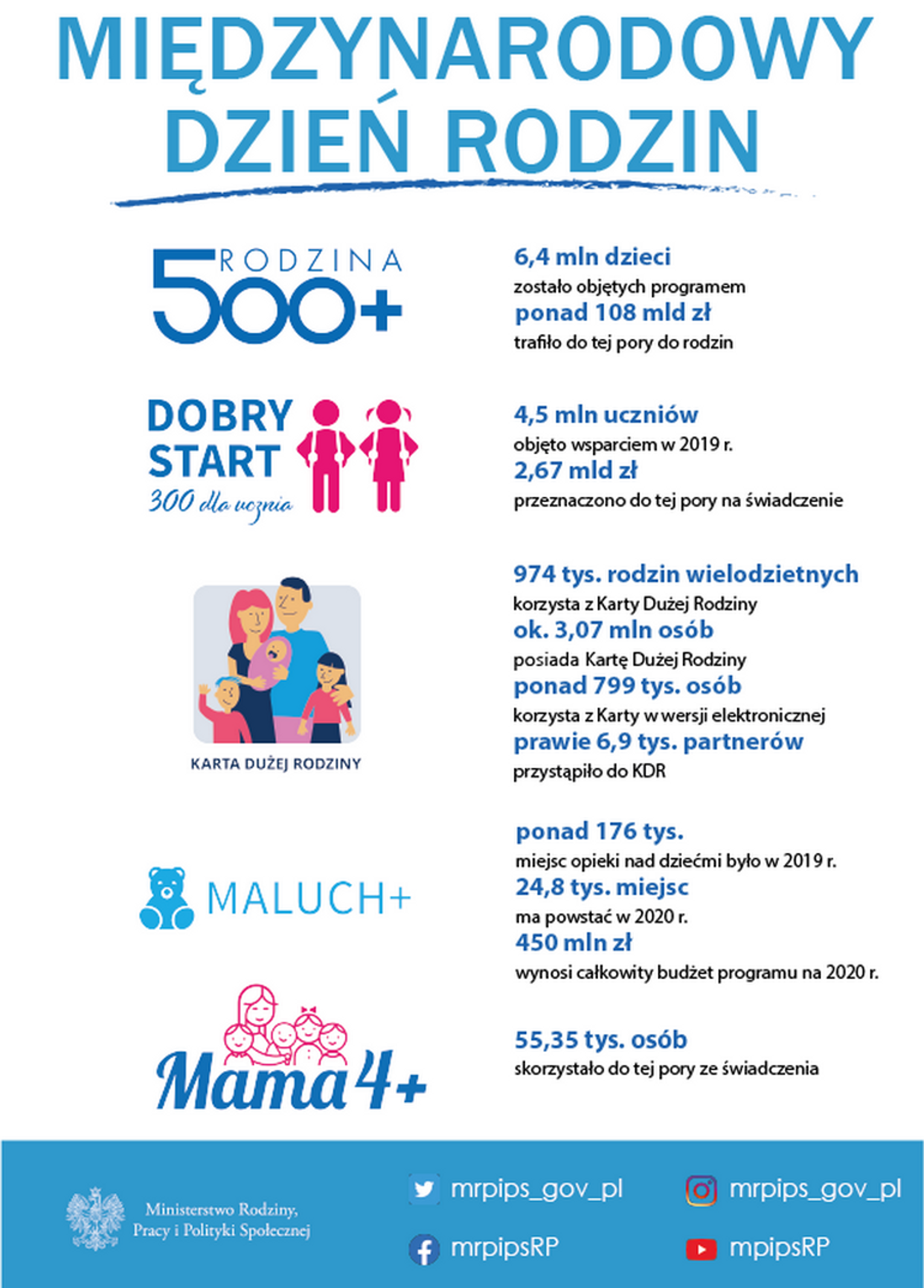 Ministerstwo Rodziny, Pracy i Polityki Społecznej od 2015 roku wprowadza kolejne programy w celu polepszenia sytuacji polskich rodzin. Najważniejszym z nich jest program Rodzina 500+, który funkcjonuje od kwietnia 2016 roku. Z tytułu 500 plus do rodzin trafiło już 108 mld złotych.