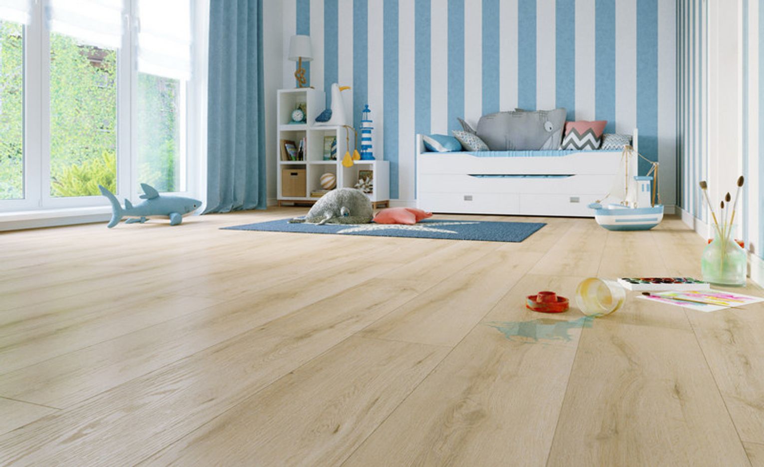 Pozostają wiec zwykłe panele laminowane oraz coraz częściej panele winylowe. Oba produkty mają szereg zalet- nie są elektrostatyczne, a więc łatwe w utrzymaniu czystości i bezpieczne dla małych stóp. Jednak panele winylowe mają tą przewagę nad panelami zwykłymi, że są wodoodporne, ciche i strukturą najbardziej zbliżone do naturalnego drewna. A podłoga w pokoju dziecięcym powinna być wodoodporna i łączyć cechy drewna – być ciepła i miła w dotyku.