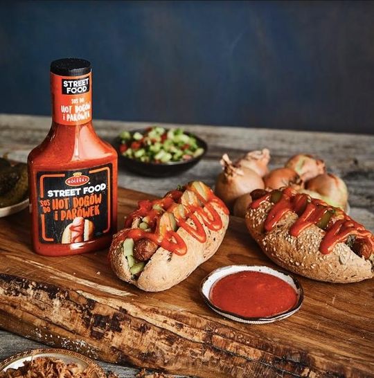 Hot dogi to zdecydowanie najpopularniejsze fast i finger food, które świetnie zaspokoją nagły głód. Najczęściej wybieranymi sosami do tego dania jest keczup i musztarda - ten duet wywodzi się z Chicago, a teraz dostępny jest w jednym sosie do hot dogów i parówek Roleski. Nie musimy się już zastanawiać nad idealną proporcją, ponieważ sos Roleski gwarantuje nam perfekcyjnie dobrane i zmieszane składniki. Sos do Hot Dogów i Parówek to połączenie goryczkowatej musztardy i łagodnych pomidorów, bez dodatku glutenu, GMO, konserwantów oraz glutaminianu sodu. Oprócz klasycznych hotdogów, idealnie sprawdza się również w połączeniu z kiełbasą z grilla czy karkówką.