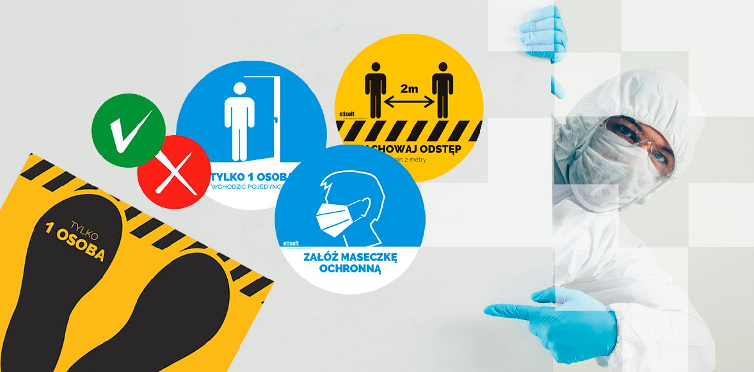Jeszcze kilka miesięcy temu nie pomyślelibyśmy, że jedną z głównych naszych trosk będzie utrzymanie odległości w miejscach publicznych, częsta dezynfekcja rąk, pilnowanie, by bez potrzeby nie dotykać powierzchni. Przede wszystkim – oczywiście noszenie maseczek. W momencie, w którym coraz więcej sklepów i placówek otworzyło swoje podwoje, ich obowiązkiem stało się zapewnienie utrzymania wymaganych odległości między osobami przebywającymi w środku. Właściciele, czy osoby zarządzające powinny także stworzyć warunki sprzyjające utrzymaniu higieny i bezpieczeństwa. W miejscach publicznych nie jest to łatwe. Z pewnością można się wesprzeć właściwymi komunikatami. Jako że szacuje się, że aż 65% populacji to wzrokowcy, warto to zrobić w formie komunikatu graficznego. Stąd dobrym rozwiązaniem jest umieszczenie w najbardziej newralgicznych miejscach graficznych oznaczeń. Na przykład w takiej formie jak naklejki ostrzegawcze i informacyjne.