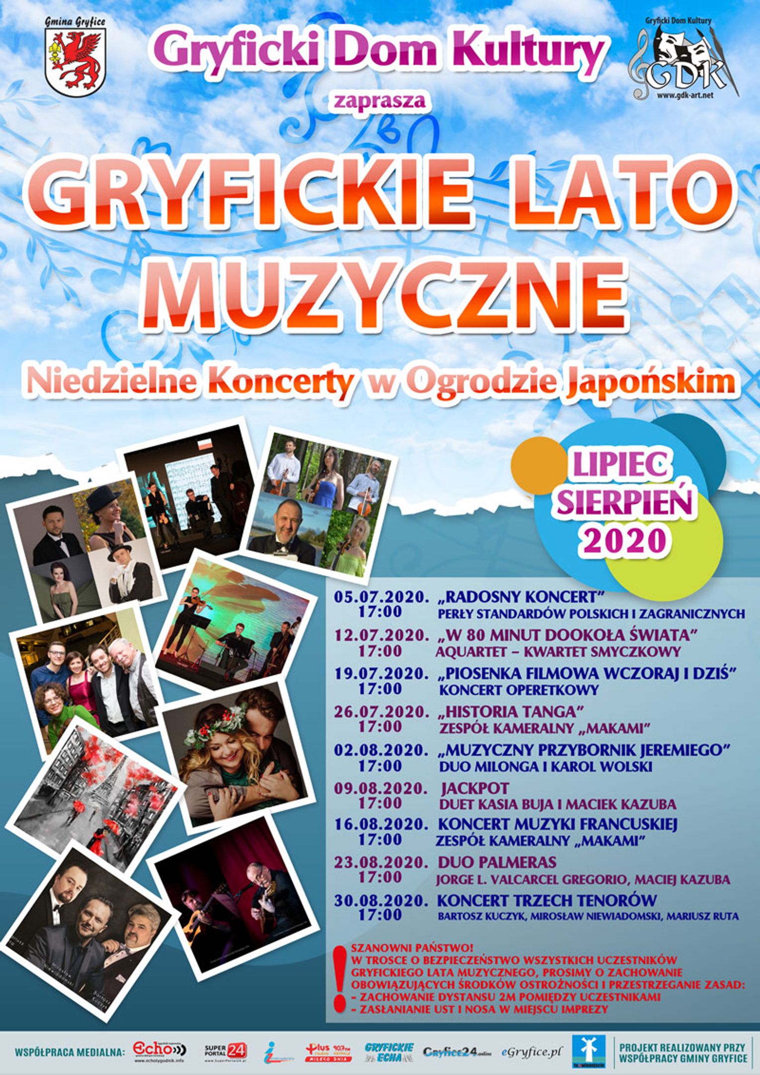 Kontynuując muzyczne spotkania w plenerze, również i w roku 2020 zaplanowaliśmy kolejną edycję Gryfickiego Lata Muzycznego, bez którego wierni słuchacze nie wyobrażają już sobie niedzielnych popołudniowych spotkań w Ogrodzie Japońskim.