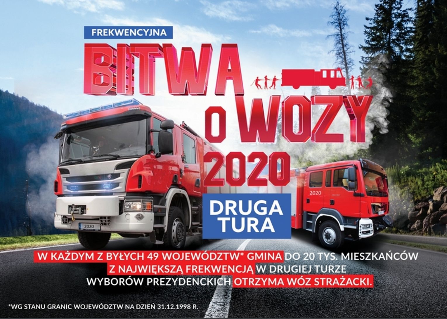 „Bitwa o wozy” jest akcją profrekwencyjną, która ma na celu propagowanie aktywnego i świadomego uczestnictwa w życiu politycznym, społecznym i gospodarczym Polski. Dzięki akcji możliwe jest docenienie lokalnych społeczności poprzez sfinansowanie wozu strażackiego, dzięki któremu strażacy-ochotnicy będą mogli jeszcze skuteczniej dbać o bezpieczeństwo mieszkańców.