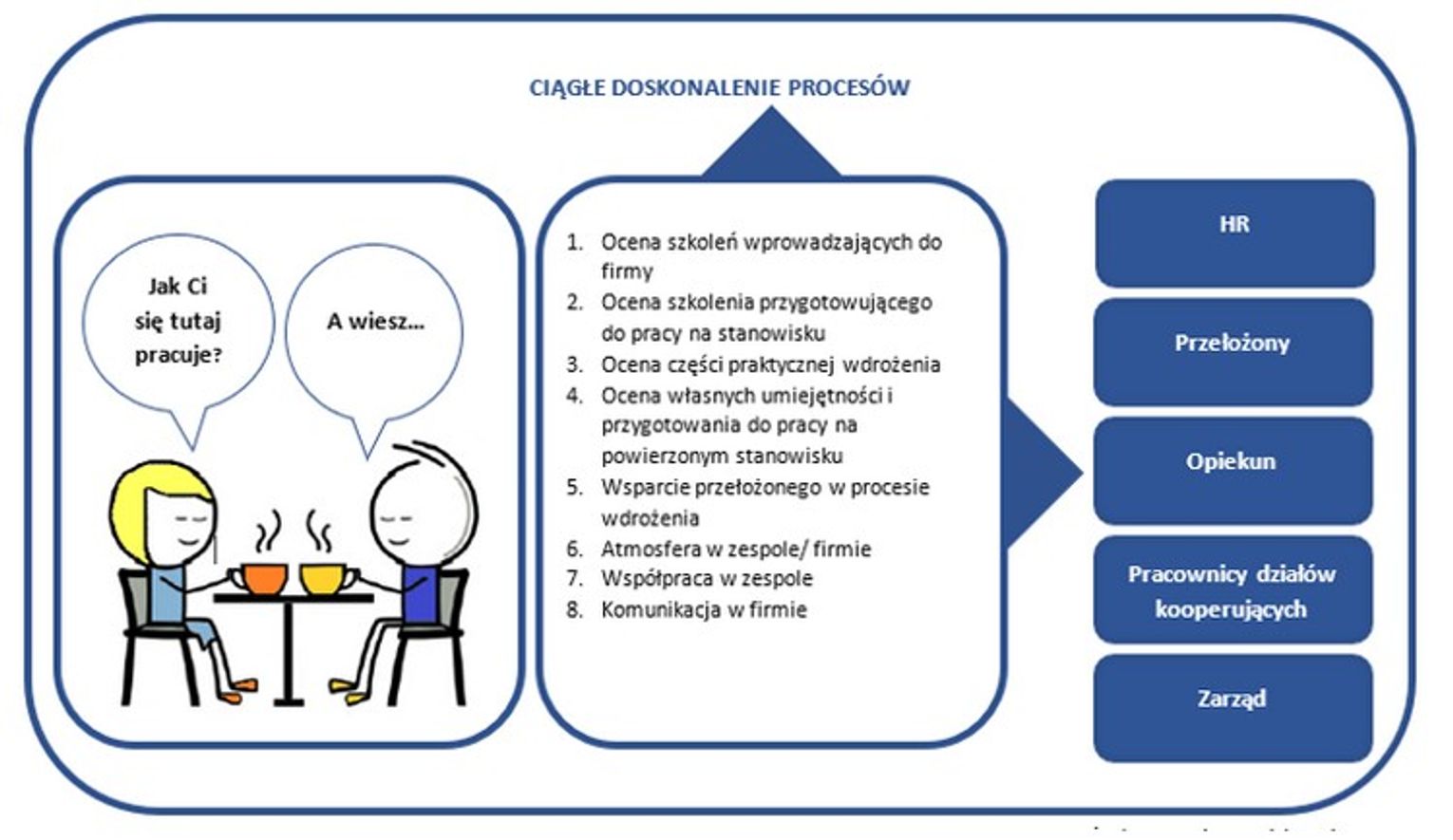 Podczas spotkań rozmawiamy o szkoleniach wprowadzających do firmy, przygotowujących do pracy na stanowisku, pytamy o przebieg części praktycznej wdrożenia oraz zaangażowanie przełożonego i współpracowników w cały proces wdrożenia. Dzięki temu możemy dokonywać ewaluacji i poprawy procesu wdrożenia na bieżąco.