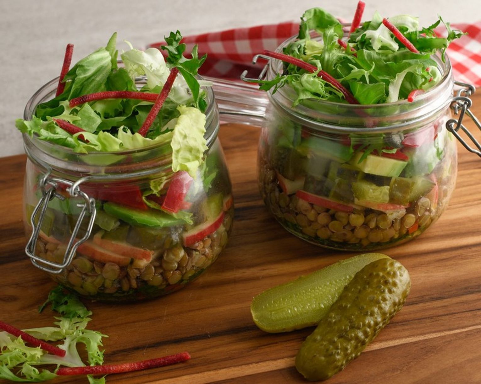 Soczewicę wrzucić do osolonej, wrzącej wody i gotować 25 min. Odcedzić i zostawić do ostudzenia. Oliwę, drobno posiekaną pietruszkę i papryczkę chilli wymieszać z sokiem z cytryny, następnie doprawić do smaku solą. Paprykę pokroić w krótkie paski, ogórek, jabłko i awokado w kostkę. Na dno słoika wlać dressing, następnie wsypać soczewicę i układać warstwowo: jabłko, ogórek, awokado, paprykę oraz mieszankę sałat