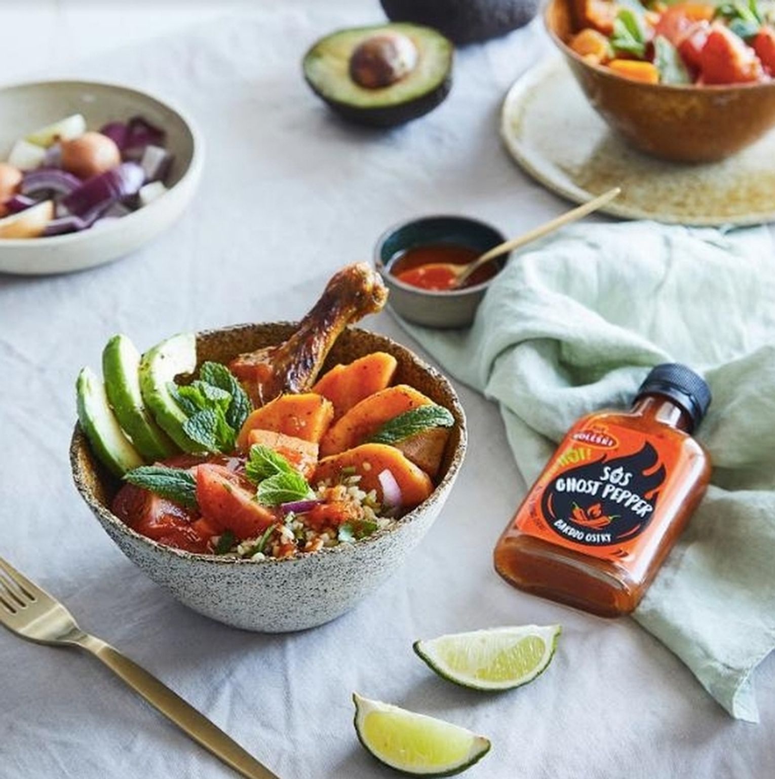 Sos Ghost Pepper, zupełnie jak reszta sosów bardzo ostrych Roleski, to doskonały sposób na wzbogacenie buddha bowl, jak i zwykłych sałatek. Nie tylko jego smak zachwyca orientalnością – formuła sosu wzbogacona jest egzotycznymi składnikami takimi jak ananas, imbir i curry, a w składzie nie znajdziemy ulepszaczy smaku ani glutenu. Dzięki temu Sos Ghost Pepper Roleski idealnie sprawdza się jako uzupełnienie kolorowej mieszanki buddha bowl. Naszą propozycją takiej miseczki obfitości jest bowl z marynowanym udkiem kurczaka, wypełniony dodatkowo pieczonymi batatami oraz awokado – danie, od którego można się uzależnić!