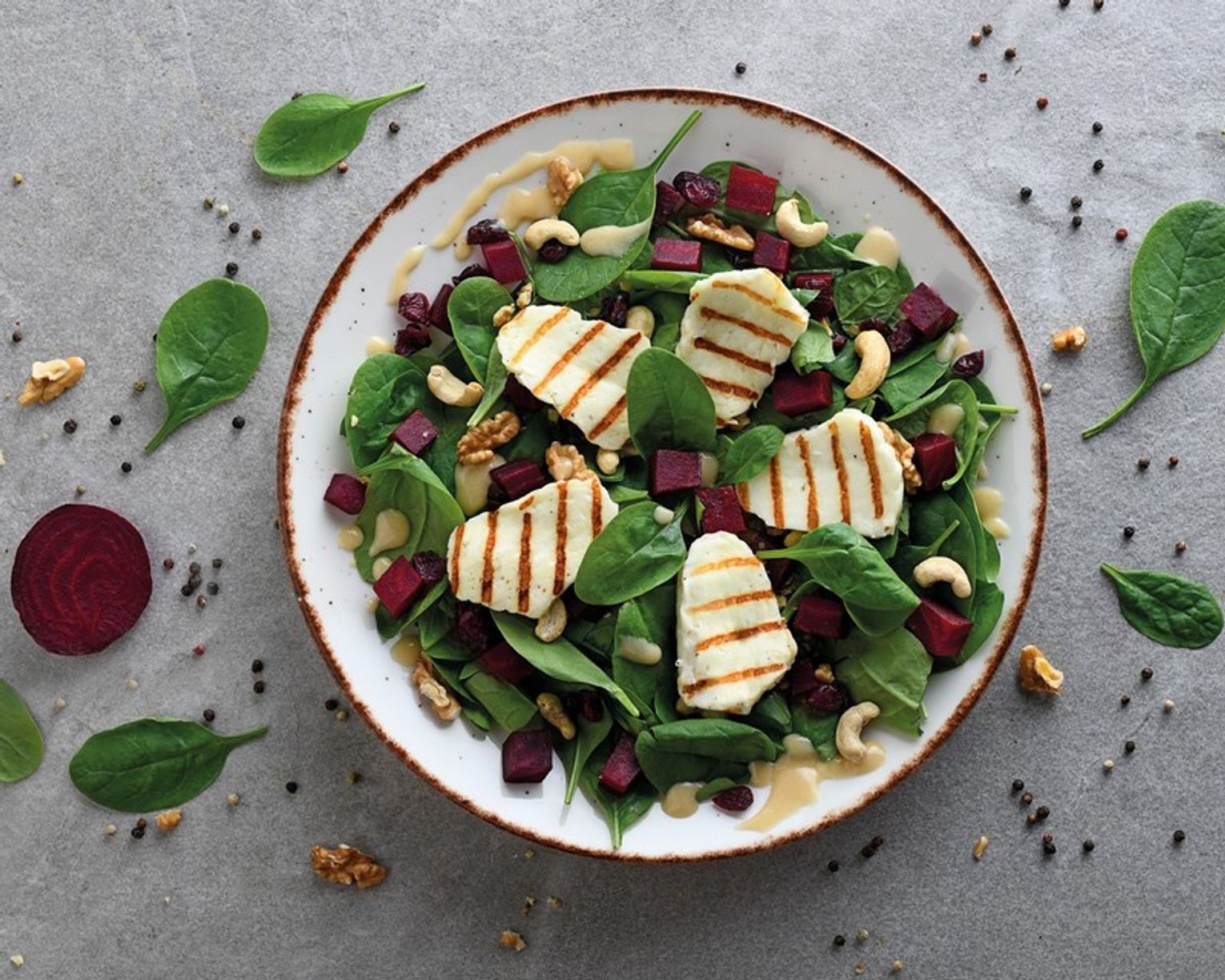 Szpinak młody marki Eisberg ułożyć w miseczce. Upieczone buraki pokroić w kostkę i wymieszać ze szpinakiem. Polać przygotowanym wcześniej dressingiem. Ser halloumi pociąć w plastry. Na patelni grillowej rozgrzać oliwę i smażyć ser aż się przyrumieni. Ułożyć go na wierzchu sałatki. Całość posypać orzechami nerkowca i włoskimi oraz żurawiną.