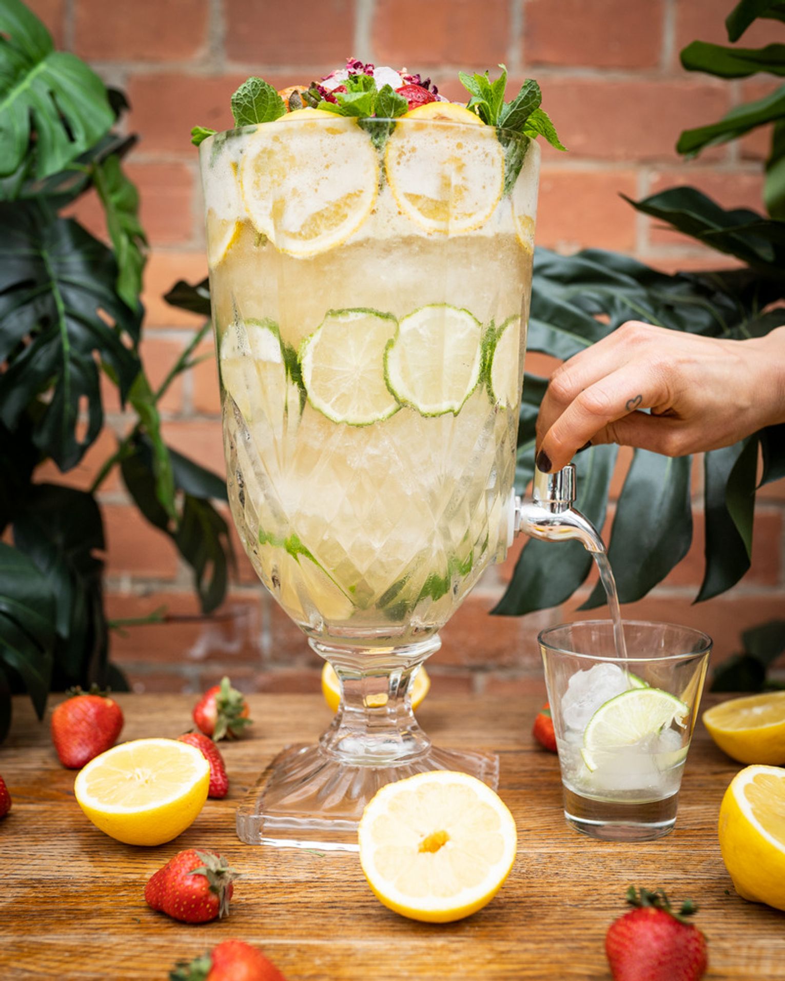 Układamy plastry limonki po obwodzie na dnie szklanki, zasypujemy kruszonym lodem do 1/2 wysokości. Następnie dodajemy taką samą metodą plastry cytryny i zasypujemy kruszonym lodem do 4/5 wysokości. Układamy plastry limonki, szczyty mięty wsadzamy w miejscach stykania się plastrów limonki. Dosypujemy kruszonego lodu do pełna. Wlewamy wszystkie składniki i dekorujemy płatkami róż.