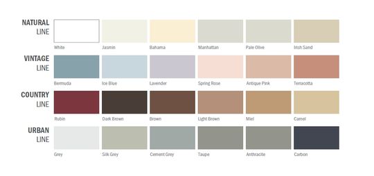 Natural Line zawiera fugi o klasycznych, jasnych barwach, inspirowanych kolorystyką natury. Odcienie: White, Jasmin, Bahama, Manhattan, Pale Olive oraz Irish Sand będą doceniane za swoją prostotę i uniwersalność – dobrze komponują z kaflami w jasnych barwach. Z kolei linia Vintage wpisze się w gusta miłośników pchlich targów, strychów pełnych wspomnień oraz przedmiotów z duszą – kolory: Bermuda, Ice Blue, Lavender, Spring Rose, Antique Pink oraz Terracotta zadowolą poszukiwaczy nieoczywistych i przygasłych odcieni. Kolory z linii Country: Rubin, Dark Brown, Brown, Light Brown, Miel i Camel idealnie oddają klimat sielskiej wsi, w której pachnie skoszonym sianem, a krajobraz dopełniają pola usiane zbożem. Sprawdzą się doskonale w rustykalnych kompozycjach. Ostatnia linia Urban to synonim miejskiego, szybkiego i nowoczesnego życia, które najlepiej oddają odcienie szarości – Grey, Silk Grey, Cement Grey, Taupe, Anthracite i Carbon. Odnajdą się idealnie w towarzystwie wielkoformatowych płytek przypominających surowy beton.
