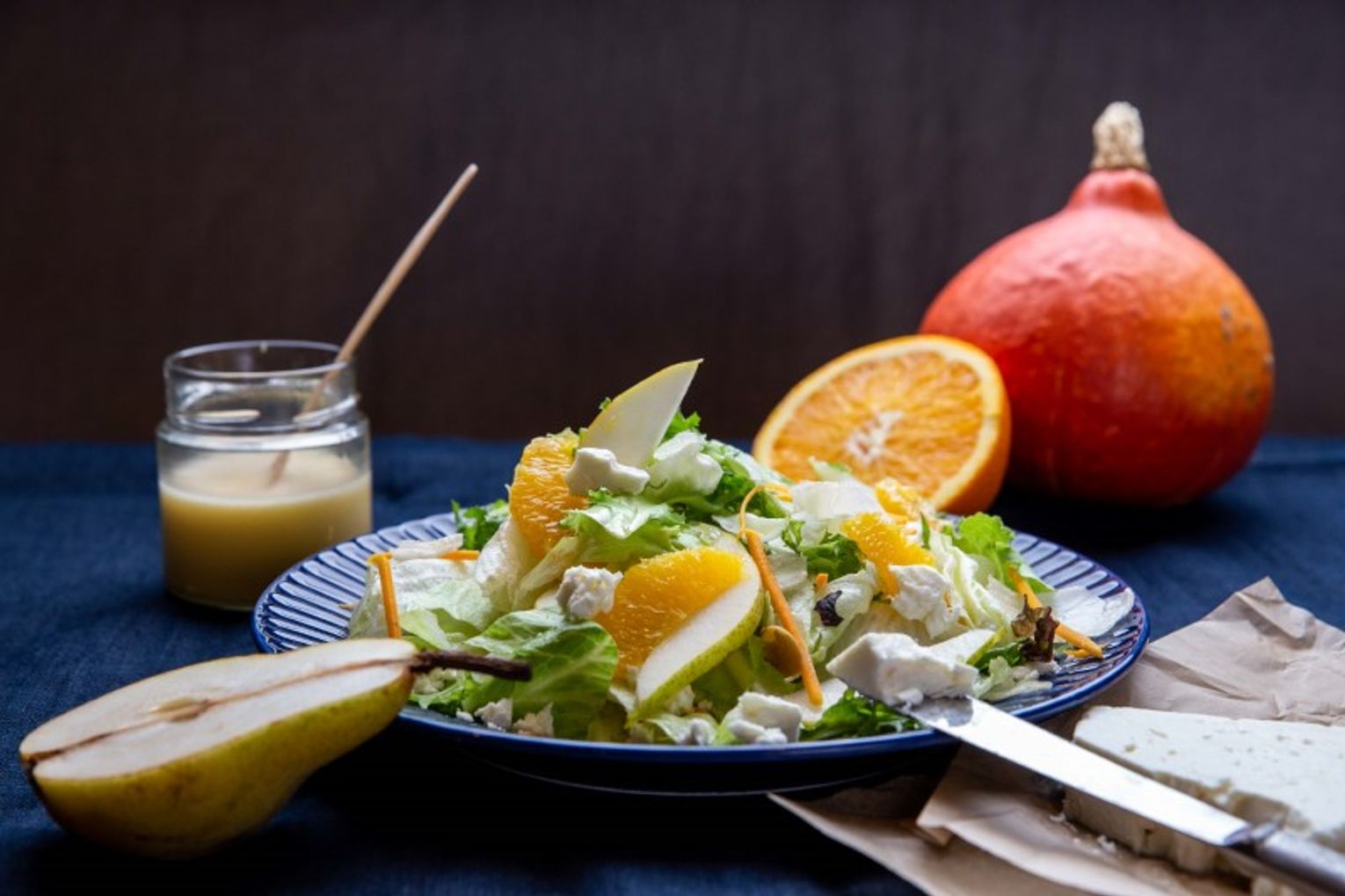 Składniki do dressingu zmieszaj ze sobą. Mieszankę sałat wsyp do miski. Gruszkę i pomarańczę pokrój w plasterki, a ser feta w kostkę. Składniki dodaj do mieszanki sałat. Całość polej przygotowanym wcześniej dressingiem.