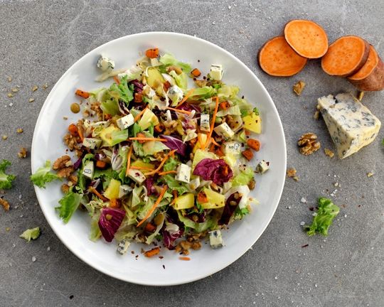 Mieszankę sałat California mix marki Eisberg ułóż w miseczce. Batata obierz ze skórki, pokrój w kostkę, posól i przypraw ulubionymi ziołami. Polej oliwą i upiecz w piekarniku (180 stopni C przez około 25 minut). Obierz ananasa. Pokrój go i ser pleśniowy w kostkę. Posiekaj grubo orzechy. Wymieszaj sałatę z batatami, ananasem i serem. Polej przygotowanym wcześniej dressingiem. Całość posyp orzechami.