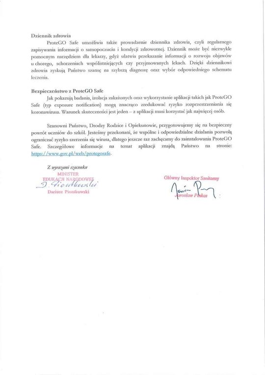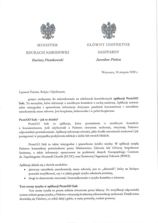 – Gorąco zachęcamy do zainstalowania na telefonach komórkowych aplikacji ProteGO Safe. To narzędzie, które informuje o możliwym kontakcie z osobą zarażoną. Aplikacja zawiera także wiarygodne i sprawdzone informacje dotyczące pandemii koronawirusa i umożliwia samokontrolę stanu zdrowia. Jest bezpłatna, dobrowolna i w pełni bezpieczna – napisali Minister Edukacji Narodowej i Główny Inspektor Sanitarny.